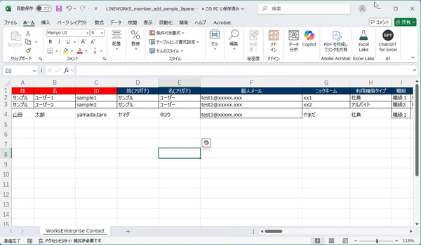 ファイルには氏名やIDなどの必須項目以外にも、すべの項目を設定できる。職級や組織、役職、電話番号、勤務先、社員番号などを入れておくとその後の管理が楽になるのでお勧めだ。