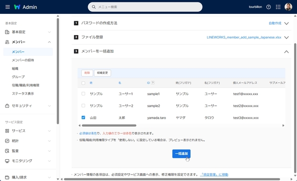 メンバー情報を入力したら、ファイルをアップロードする。ファイルの中身が表示されるので、追加するユーザーにチェックを入れる。また、必須入力の項目が入っていないと青色で表示され、入力値が変だと赤色で表示されるので、修正しよう。問題が解消されれば「一括追加」ボタンをクリックできるようになる。追加後は、登録されているメールアドレスに通知メールを送ることもできる。