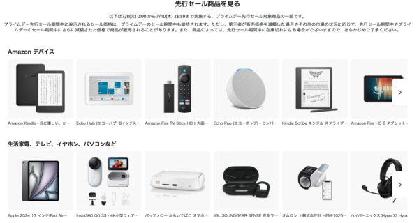 なお、先行セールの対象商品は、本番のプライムデーにおいても継続してセール価格にて販売予定。ただ、先行セール期間中に在庫切れになる場合がある点は注意が必要ですね。
