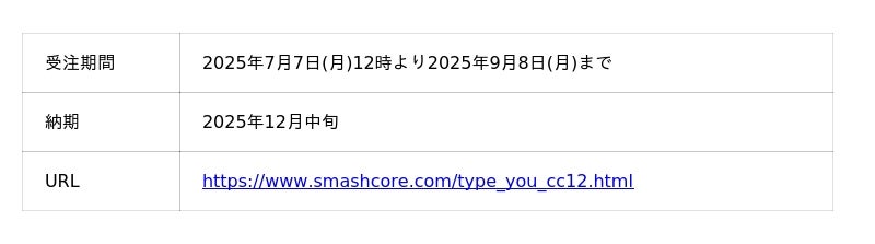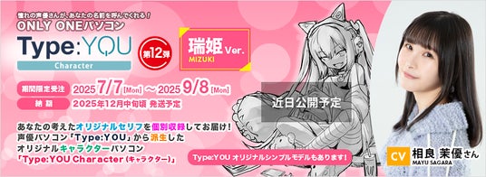 株式会社スマッシュコア エンターテインメント(本社:東京都中央区、代表取締役:福池功)は、自社が運営する「オンリーワンPCストア【スマッシュコア】」にて、2025年7月7日(月)より2025年9月8日(月)までの期間限定で、声優オリジナルパソコンのキャラクターシリーズ【Type:YOU Character(読み:タイプ ユー・キャラクター)】第12弾の受注を開始いたしました。
