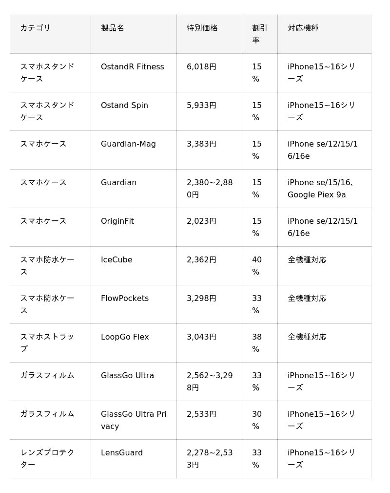 セールでは、スタンド付きスマホケースや充電器、夏のお出かけにぴったりの冷却グッズなど、TORRASの人気アイテムを最大40%OFFでお買い求めいただけます。