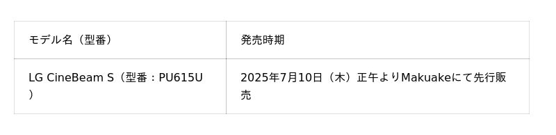 LGエレクトロニクス・ジャパン株式会社(代表取締役:孫 成周(ソン・ソンジュウ)、本社:東京都中央区)は、プロジェクターシリーズ『LG CineBeam』の新モデルとして、置き場所フリーの4Kレーザープロジェクター「LG CineBeam S」(型番:PU615U)を、2025年7月10日(木)正午から8月30日(土)22時まで、アタラシイものや体験の応援購入サービス「Makuake(マクアケ)」にて先行販売いたします。