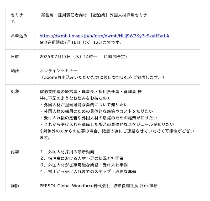 パーソルグループで外国人材に特化した人材サービスを提供するPERSOL Global Workforce(パーソル グローバルワークフォース)株式会社(本社:東京都港区、代表取締役社長:多田 盛弘)は、2025年7月17日(木)に宿泊業関係の経営者・採用責任者向けに「外国人材採用セミナー」を開催します。ホテル、旅館などの宿泊施設ではさまざまな分野(業務)において人材が不足しており、今回はそれぞれの業務を担当できる外国人材の在留資格・分野を網羅した形で、採用に関する具体的なステップを解説します。なお、本セミナーはオンライン開催、参加無料です。