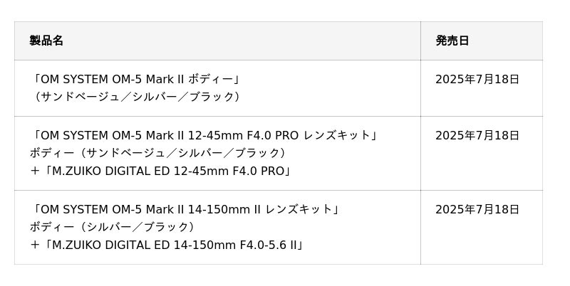OMデジタルソリューションズ株式会社が展開する映像製品ブランド「OM SYSTEM」は、2025年7月下旬発売予定とご案内しておりましたミラーレス一眼カメラ「OM SYSTEM OM-5 Mark II」の発売日について、以下の通り決定いたしましたのでお知らせいたします。