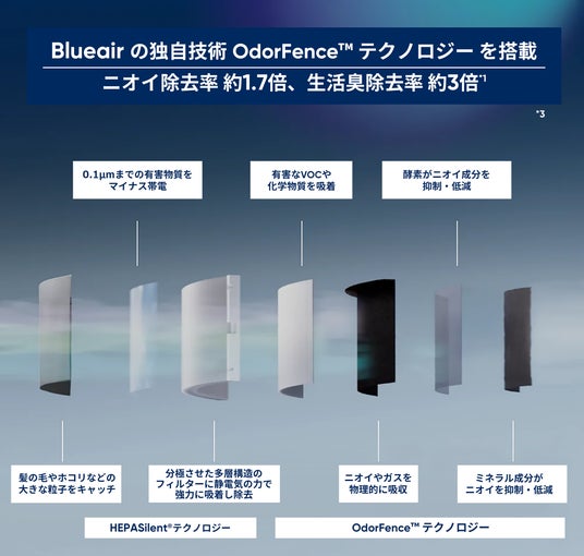 さらに、最新の独自技術「OdorFence(TM) テクノロジー」を組み合わせ、従来モデル「Blue Max 3450i」と比較してニオイ除去率 1.7倍、生活臭除去率 3倍*¹を実現しました。7層※のフィルター構造で、ニオイの原因となるガスを低減*¹し、最大限の脱臭効果を発揮します。フィルターは脱着しやすい構造に向上しているため、お手入れも簡単です。