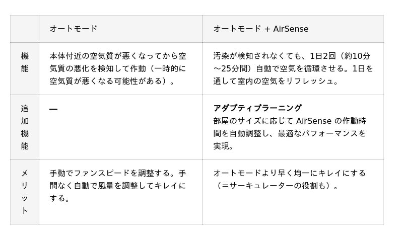さらに、オートモードを進化させた「AirSense」を搭載。「AirSense」をオンにすることで、1日2回、自動で室内の空気を循環させ、部屋の空気が汚染される前に効果的に清浄できます。1時間あたりの電気代は約0.06円*⁴、8畳の清浄時間5分*³と、暮らしに優しい設計です。