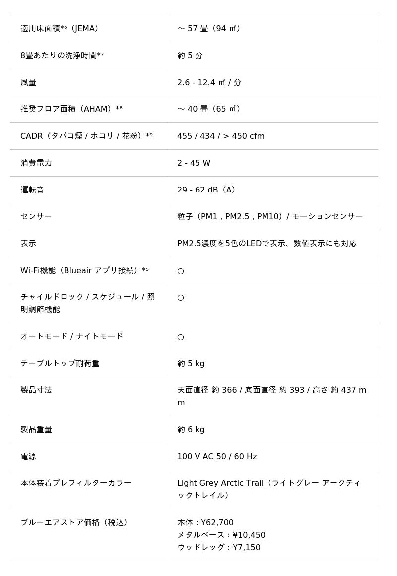*⁹ ANSI/AHAM AC-1規格に基づく試験結果。各項目の最高値は次の通り。タバコ煙:600cfm/ホコリ:600cfm/花粉:450cfm