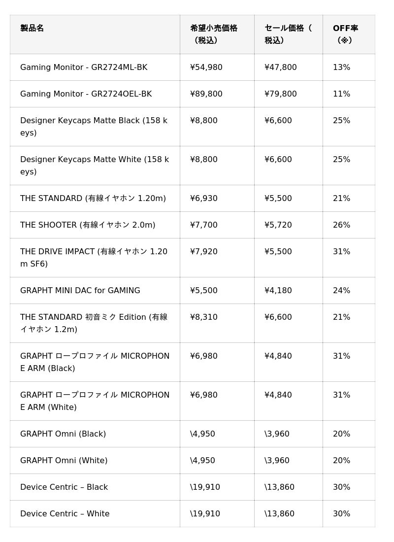 この度、2025年7月8日(火)から7月21日(月)まで『GRAPHT PREMIUM SUMMER SALE』を開催いたします。本セールは、GRAPHT OFFICIAL STORE(ECサイト)、GAMING CENTER by GRAPHT Amazonブランドストア、および全国の家電量販店やPC専門店などで一斉に実施。先日保証期間を延長したモニターに加え、ゲームパッド、イヤホンなど、ゲーミングライフをアップグレードする15製品を、最大31%オフの特別価格でご提供いたします。この機会にぜひGRAPHT製品をお得にお求めいただければ幸いです。