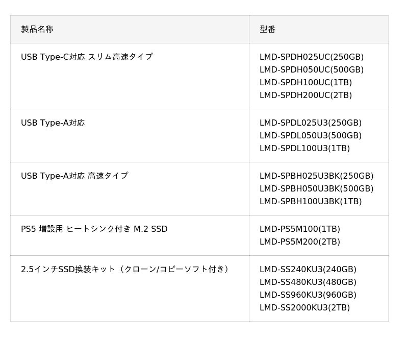 スティック型SSDやPS5対応の内蔵M.2 SSD、換装用2.5インチSSDキットなど、用途に応じた多彩なモデルを容量別で出品。