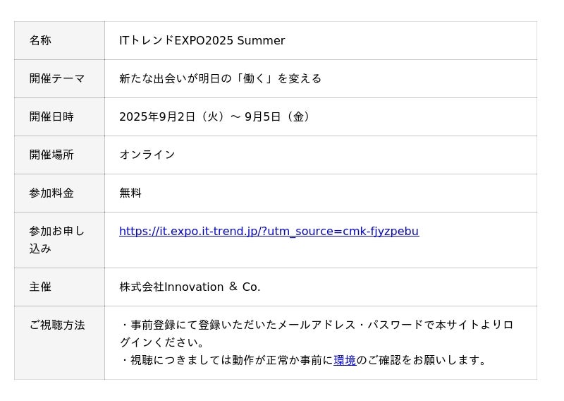 株式会社ハートビーツ(本社:東京都新宿区、代表取締役:藤崎正範、以下「ハートビーツ」)は、業界最大級のオンライン展示会「ITトレンドEXPO2025 Summer」に出展します。