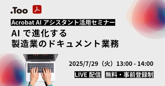クリエイティブ市場の総合商社・株式会社Too(本社/東京都港区虎ノ門3-4-7、社長/石井剛太、以下Too)は、 Acrobat AIアシスタント活用セミナー「AIで進化する製造業のドキュメント業務」を2025年7月29日(火)に開催します。