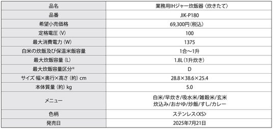 熱制御テクノロジーで世界をリードするタイガー魔法瓶株式会社(社長:菊池嘉聡、本社:大阪府門真市)は、1升炊きの業務用IHジャー炊飯器〈 炊きたて〉 JIK-P180 を2025年7月21日に発売いたします。
