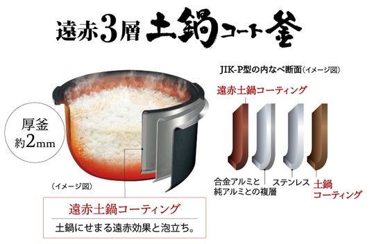 熱伝導性のよい素材を組み合わせ、遠赤効果の高いコーティングを施した「遠赤3層土鍋コート釜」。金属を重ねた3層構造により、効率よく内なべが発熱。土鍋素材の遠赤コーティングで遠赤効果を高め、お米一粒ひと粒にまで熱を広く伝えて、ごはんを甘くおいしく炊きあげます。
