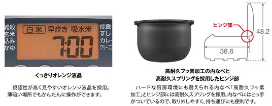 家庭用モデルでも好評の「遠赤3層土鍋コート釜」採用。お米一粒ひと粒にまで熱を広く伝えて、ごはんを甘くおいしく炊きあげます。
