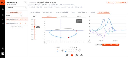 データからは、左右ストロークの差、インスイープやアウトスイープによって推進力を奪っている箇所、疲労に伴ってストロークがどのように変化するかなど、自身の泳ぎを詳細に確認できます。これらのデータはすべて、ラップごと、あるいはストロークごとに見ることができ、さらにビデオと同期することで実際の手の動きを見ながら改善点を簡単に確認することも可能です。訓練された経験豊富な目や、優れた感覚を持つスイマーでさえ、eo SwimBETTERが提供する正確なデータと洞察にはかないません。