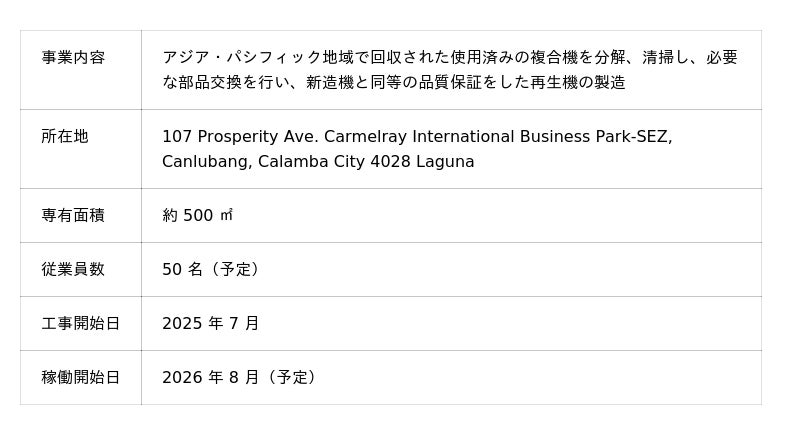 富士フイルムビジネスイノベーション株式会社(本社:東京都港区、代表取締役社長・CEO:浜 直樹)は、アジア・パシフィック地域における資源循環の取り組みを強化するため、フィリピン・ラグナ州に再生機の製造を行い、資源循環を促進する拠点「Circular Manufacturing Center(サーキュラー・マニュファクチャリング・センター、以下CMC)」を開設します。稼働開始は、2026年8月の予定です。