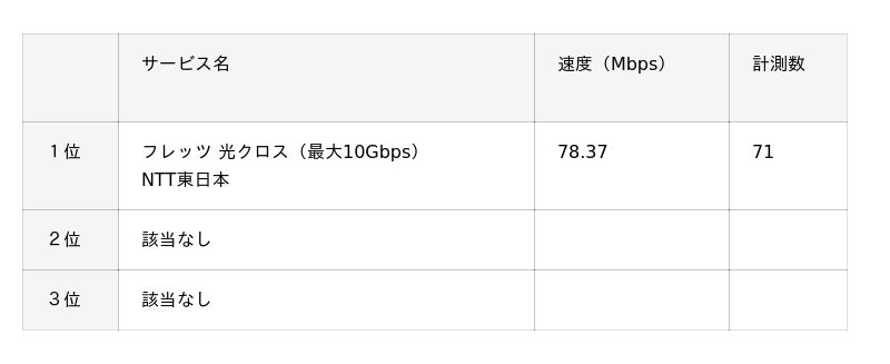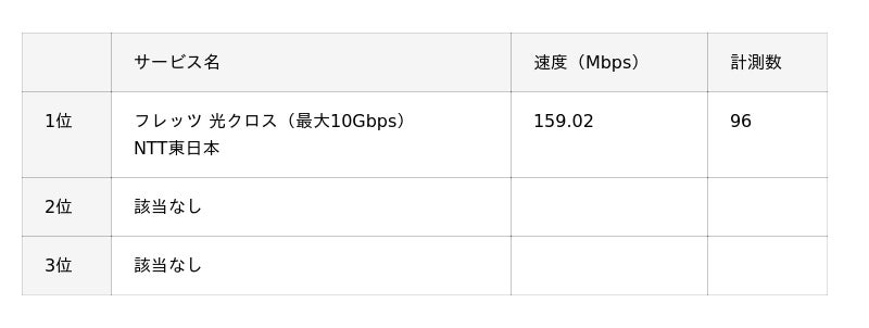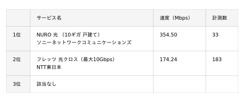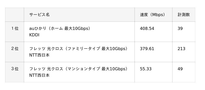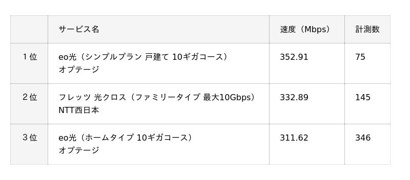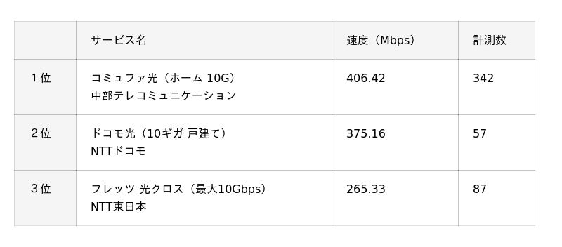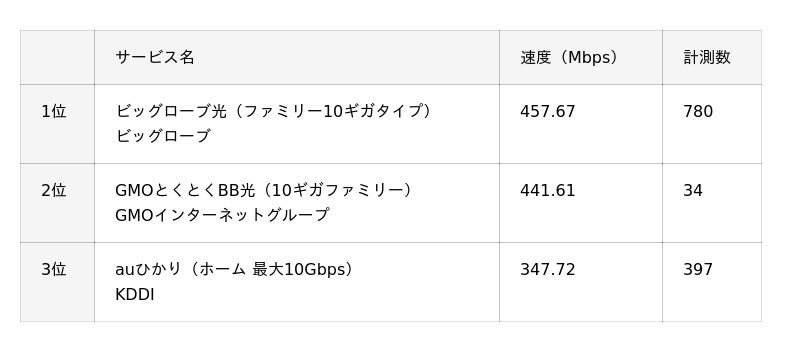 注目すべき点として、GMOインターネットグループの「GMOとくとくBB光(10ギガファミリー)」が441.61Mbpsで初めて3位にランクインしたことが挙げられます。以下に10位までの結果を掲載いたします。