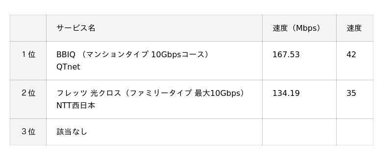 1位の事業者は地域ごとに異なり、北海道・甲信ではフレッツ光、東北ではNURO光、関東ではビッグローブ光、東海ではコミュファ光、近畿ではeo光、四国ではauひかり、九州ではBBIQがトップとなりました。