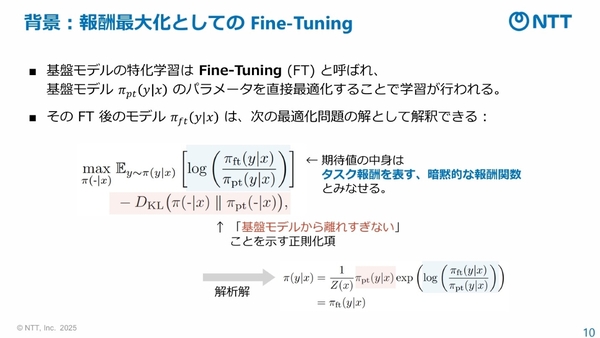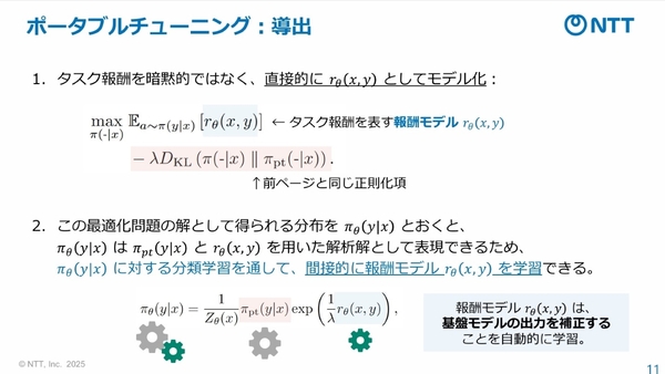 この解釈に基づき、この暗黙的なタスク報酬を直接モデル化(報酬モデル)するのが、本技術のポイントとなる。学習時には暗黙的ではなく直接的に報酬モデルを学習し、推論時にも報酬モデルの値を最大化する方向で基盤モデルの出力を補正する、新たな学習の枠組みを導出する。また、その学習過程を解析することで、モデル自身からの出力に関する報酬期待値は抑制し、正解データに対する報酬値は大きくする方向に報酬モデルの学習が進み、実際に報酬学習として期待される学習を発揮することも確認しているという。