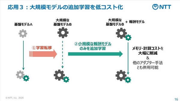 大規模モデルの追加学習コストを低減することも可能だ。小規模な報酬モデルのみで追加学習させていくことで、学習時の計算コストを大幅に削減できる。「アダプター的な使い方ができ、かつ他のアダプター手法とも併用できる」(千々和氏)