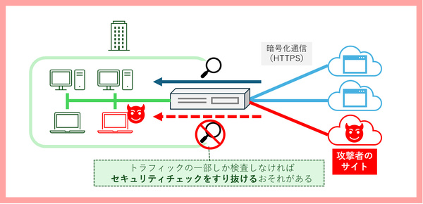その結果生じるのが、今回取り上げたような、暗号化トラフィックを“隠れみの”にしてマルウェアなどの脅威が侵入する事故である。すでに、サイバー攻撃の大半がHTTPS通信を使うようになっており、Webトラフィックを検査なしで素通りさせるのは非常に危険だ。