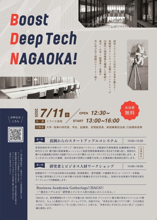 本プロジェクトへの参加に伴い地元新潟県長岡市にて“Boost Deep Teck Nagaoka”が開催される(主催は長岡市他)長岡技術科学大学発のスタートアップである(株)パンタレイの軌跡を、代表である佐藤靖徳をはじめメンバーが振り返り、長岡市がもつスタートアップのエコシステムの活用法などを紹介、また研究者、起業家、学生が参加する技術の社会実装の基礎を学ぶセミナー・ワークショップも開催する(参加無料)。