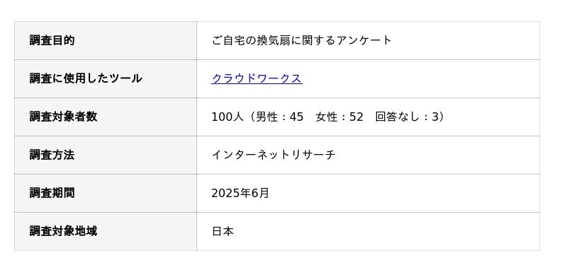 おうちにプロでは、換気扇の交換作業にお悩みの方により有益な情報を提供するために、「ご自宅の換気扇に関する独自調査」を実施しました。アンケート調査の概要は以下の通りです。