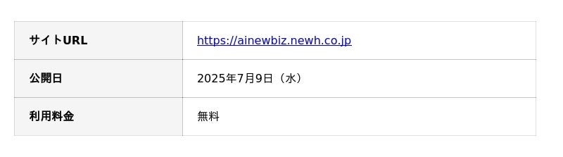 株式会社NEWh(本社:東京都千代田区、代表取締役:神谷 憲司、以下「NEWh」)は、生成AIを活用した事業開発の実践的手法をまとめた「生成AI×事業開発の実践ガイド」サイト(https://ainewbiz.newh.co.jp)を2025年7月9日に公開しました。