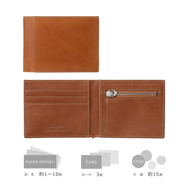 1枚の革でなく、あえて2枚の革を合わせ縫製することにより、ポケットに入れても邪魔にならないフラットな形状を実現しました。丈夫なYKKファスナーを使用し、折り畳んでも厚くならず、収納力もしっかり確保。