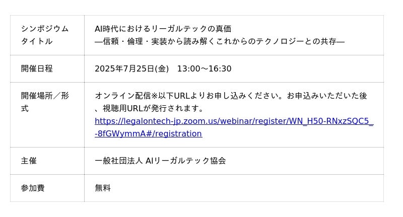■AIリーガルテック協会主催 オンラインシンポジウム「AI時代におけるリーガルテックの真価 ―信頼・倫理・実装から読み解くこれからのテクノロジーとの共存―」概要