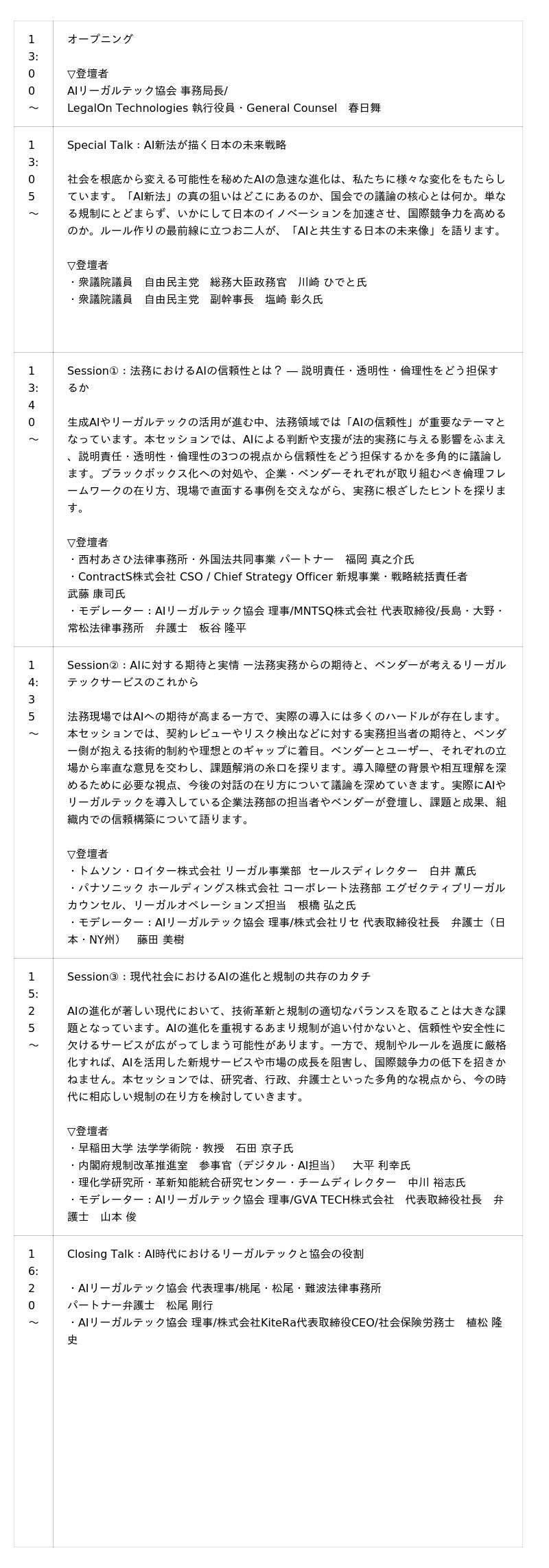本シンポジウムでは、「信頼性」「倫理性」「実装」という3つの視点から、AIとリーガルテックが法務業界にもたらす価値と課題を多角的に捉えます。企業法務・弁護士・研究者・政策立案者といった多様な立場から、リアルな実務の声や最新の技術・制度動向を交え、「テクノロジーとの共存」を実現するためのヒントについて、セミナー形式でお届けします。なおMNTSQ代表 板谷は、13:40からのセッションにモデレーターとして登壇予定です。