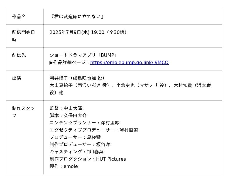230万DL超えのショートドラマアプリ「BUMP」を提供するemole株式会社(本社:東京都目黒区、代表取締役:澤村直道、以下、当社)は、『君は武道館に立てない』(著:多田基生/コアミックス)を実写化した、同名のBUMPオリジナルショートドラマを、2025年7月9日(水)19:00よりBUMP独占配信します。