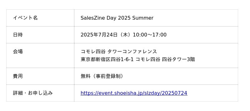 SFAとインサイドセールスで営業のデジタル化と売上アップを支援するSALES GO株式会社(所在地:東京都中央区、代表取締役社長:内山 雄輝、以下SALES GO)は、取締役副社長 COO/CPO 石井 賢が、2025年7月24日、コモレ四谷 タワーコンファレンスにて株式会社翔泳社 SalesZine編集部が主催するイベント「SalesZine Day 2025 Summer」に登壇することをお知らせします。