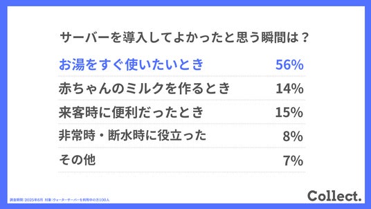 「お湯をすぐ使いたいとき(56%)」と、温水が瞬時に使える点が高く評価されました。その他には「赤ちゃんのミルクを作るとき」(14%)や「来客時に便利だった」(15%)といった日常の細かな場面でも活躍している様子がうかがえます。
