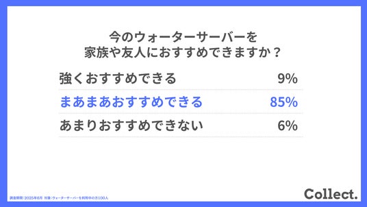 - ウォーターサーバーを「まあまあおすすめできる」が85%、満足度が紹介意欲に直結