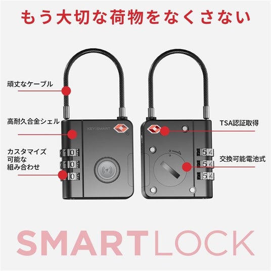 アメリカ運輸保安局(TSA: Transportation Security Administration)認証取得製品のため、空港検査でも安心して預けることができます。また、高耐久合金ボディを搭載し、交換式可能な充電式バッテリーのため、大切な荷物を守るための頑丈設計です。