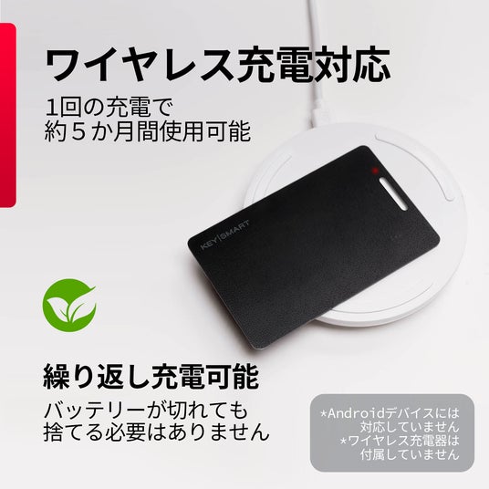 面倒な電池の入れ換えなしで使用できます。(カード型:1回の充電で5か月使用可 キーホルダー型:1回の充電で1か月使用可)バッテリー残量は探すアプリで確認可能です。