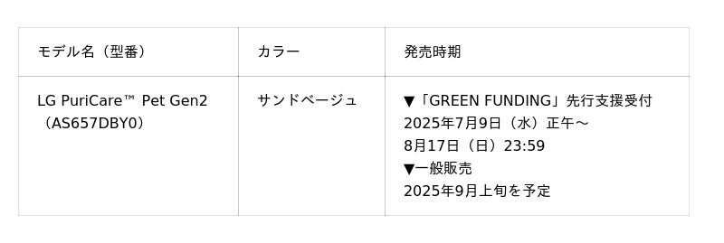 LGエレクトロニクス・ジャパン株式会社(代表取締役:孫 成周(ソン・ソンジュウ)、本社:東京都中央区)は、ペット向け空気清浄機「LG PuriCare(TM) Pet Gen2」(読み:エルジー・プリケア・ペットジェンツー)の発売を決定し、本日2025年7月9日(水)正午から8月17日(日)23:59まで、CCC(TSUTAYA)グループの株式会社ワンモアが運営するクラウドファンディングサイト「GREEN FUNDING」にて先行支援を受け付けます。
