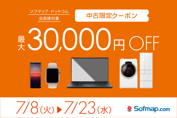 ソフマップは、期間限定で中古の液晶テレビや家電製品、電子機器を最大30,000円引きで購入できるクーポンを配布中だ。このキャンペーンは7月23日12時まで実施されている。