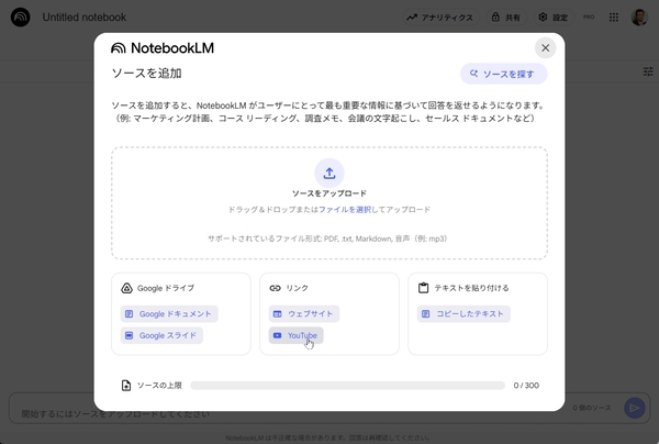 NotebookLMを開き、「新規作成」→「リンク」→「YouTube」をクリックし、動画のURLを貼り付け、「挿入」をクリックすればいい。文字起こしされたテキストが自動的にインポートされる。