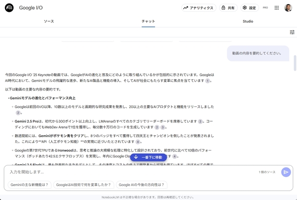 次は、5月に開催されたGoogle I/O '25 Keynoteの動画から情報収集してみよう。1時間56分の動画なので、ゆっくりと視聴する時間がないという人や英語&字幕で見るのが面倒に感じる人もいるのではないだろうか。そんな時も生成AIの出番だ。