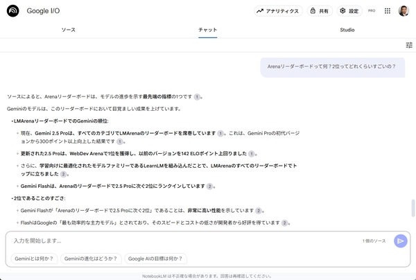 例えば「Arenaリーダーボードで2位の性能」というのが、何を指してどうすごいのかわからないなら、素直に聞いてしまってもOK。あくまでもソースの中から回答するので、期待する内容にならないこともある。そんな時は、そのプロンプトをGeminiやChatGPTに入れれば、膨大な情報を元に噛み砕いて説明してくれる。