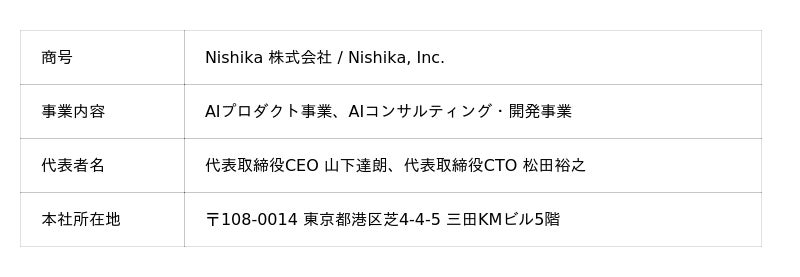 今回の受賞を励みに、Nishikaは「テクノロジーですべての人が誇りを持てる社会を」というビジョンの実現に向け、AIの”実用”に拘り、企業の生産性向上に貢献するプロダクト開発をさらに加速させてまいります。