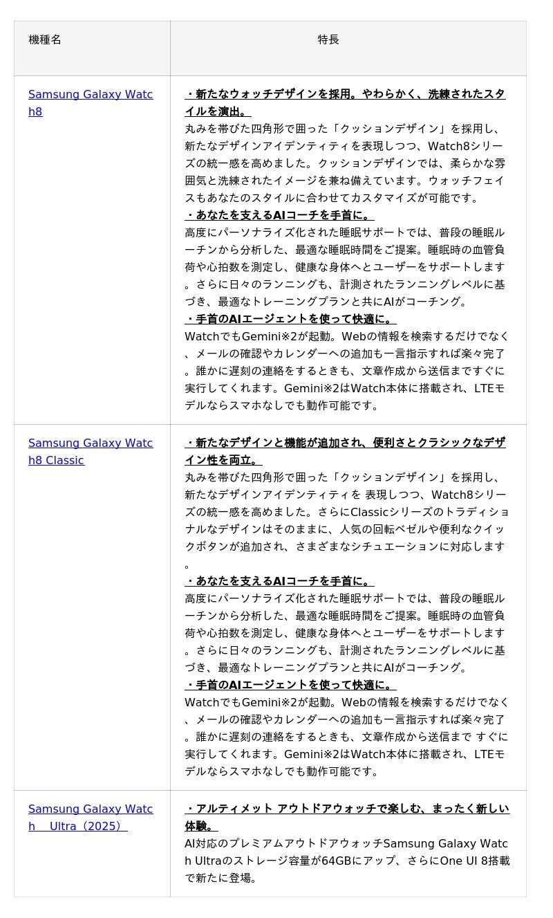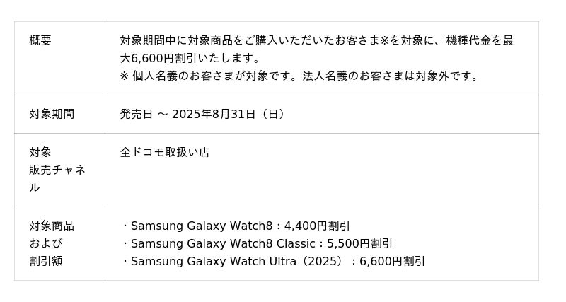 株式会社NTTドコモ(以下、ドコモ)は、Galaxy AI対応スマートウォッチ「Samsung Galaxy Watch8」「Samsung Galaxy Watch8 Classic」、および「Samsung Galaxy Watch Ultra(2025)」を2025年8月上旬以降に発売いたします。発売に先立ち、2025年7月17日(木)より予約受付を開始いたします。