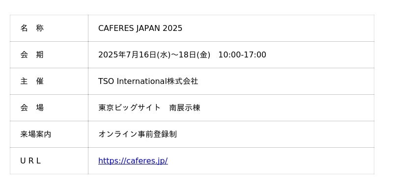 ポスタス株式会社(本社:東京都中央区、代表取締役社長:本田 興一、以下:ポスタス)は、2025年7月16日(水)~18日(金) に東京ビッグサイトで開催される、日本最大級のカフェ・ベーカリー・スイーツ店舗向け専門展「CAFERES JAPAN (カフェレスジャパン)2025」に出展します。昨年7月に開催された「CAFERES JAPAN (カフェレスジャパン)2024」に続き、東京会場では3回目の出展となります。