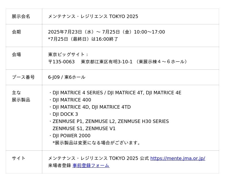 民間ドローンとクリエイティブカメラ技術の世界的リーダーであるDJIは、2025年7月23日(水)から25日(金)まで、東京ビッグサイト(東京都江東区)で開催される「メンテナンス・レジリエンス TOKYO 2025」に出展します。最新機材を展示するほか、産業用ドローンおよびドローンを活用したソリューションをご紹介いたします。