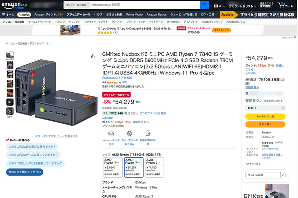 購入したのは、8コア/16スレッドのAMDモバイルプロセッサー「Ryzen 7 7840HS」をベースにしたミニPC「Nucbox K6」になる。購入するに至った大きな理由は、そのコンパクト性とAmazonのタイムセールなど6万円を切ることがある。