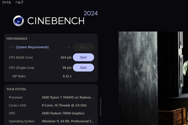 スコアはマルチコア824、シングルコア99だった。高スコアとは言えないが、最新アーキテクチャー「Zen 5」を採用する16スレッドの「Ryzen AI 7 350」で、マルチコアは約990、シングルコア約120となっているので、価格を考えれば十分なスコアと言えるだろう。