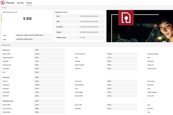 まずまずのCPU性能を発揮したRyzen 7 7840HS。では、日常から学業、仕事で使うマイクロソフト「Office(Microsoft 365)」は、どうだろうか。実際にOfficeで処理を行なって、その性能を計測する「UL Procyon:Office Productivity Benchmark」でチェックしてみた。