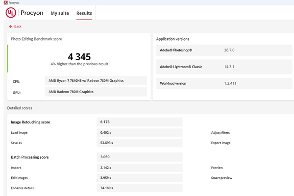次はAdobeの画像編集系アプリケーション「Photoshop」と「Lightroom Classic」を実際に使って、パフォーマンスを計測する「UL Procyon:Photo Editing Benchmark」で確認していこう。